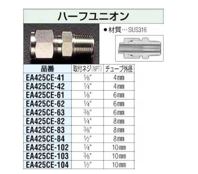 材質SUS316 エスコ品番EA425CE-41 形状ハーフユニオン 寸法H(mm)28.5 寸