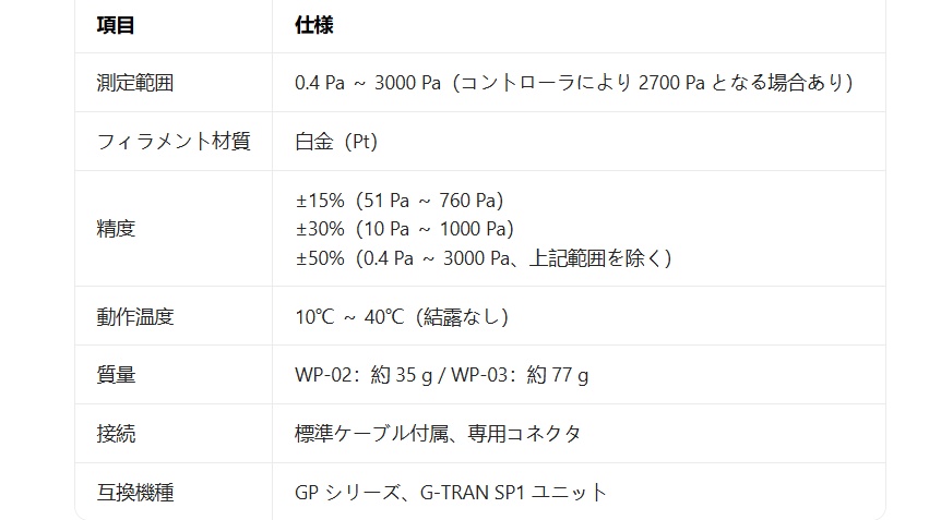 定温度型ピラニ真空計用センサヘッド(測定子)。気体の熱伝導現象を利用し、0.4 Pa ~ 3000 Pa の低真空領域を高精度に測定。フィラメントに ** 白金(Pt)** を採用し、大気圧暴露時の耐久性に優れ、腐食性ガス環境でも安定動作。GP シリーズ(GP-1G、GP-1000G、GP-2001G)、G-TRAN SP1 ユニットと完全互換、消耗品として簡単に交換可能。