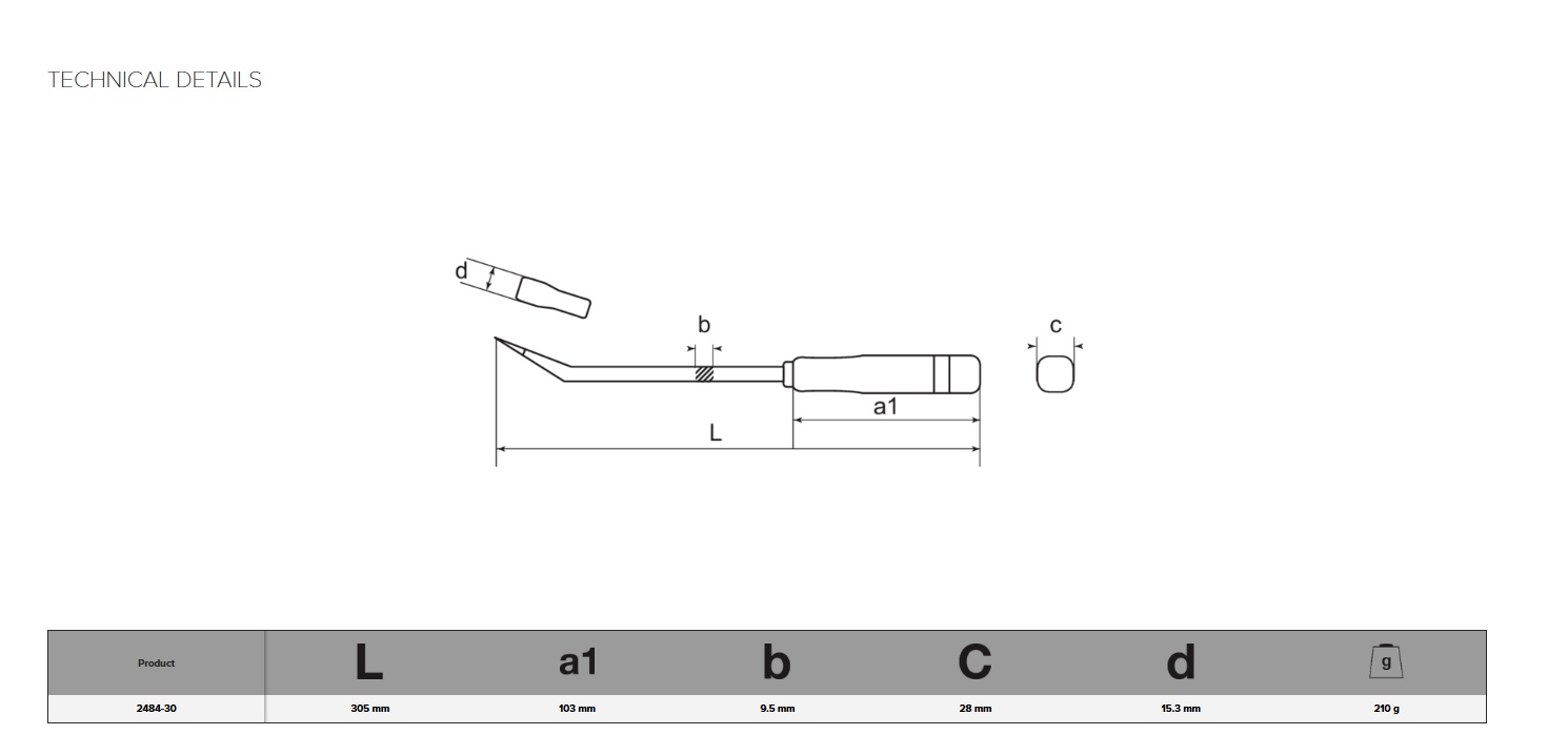 结构:平头弯形刀头,便于插入缝隙;杆身刚性强,手柄握持直径适中,省力设计