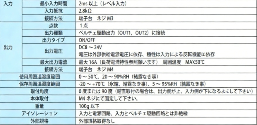 仕様最少入力時間:2ms以上(レベル入力)、入力接続方法:端子台、ネジM3、出力種類:ペルチェ駆