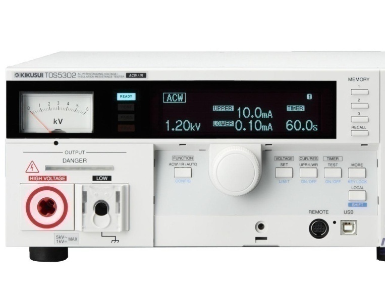 KIKUSUI(菊水電子工業)のTOS5302は、AC 耐電圧試験と絶縁抵抗試験を一体化した安全試験器で、電気製品・電子部品の安全性確保に必要な試験を効率的に実施可能。IEC・EN・UL・VDE・JIS 等の国内外規格に対応し、研究開発・品質保証試験施設・標準認証・製造ライン等で広く使用されている。