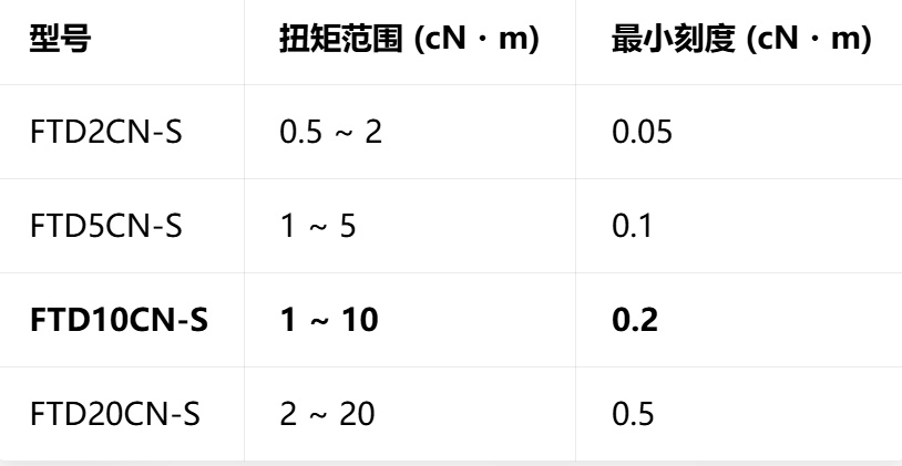 扭矩范围:1.0 ~ 10 cN·m (0.01 ~ 0.1 N·m)