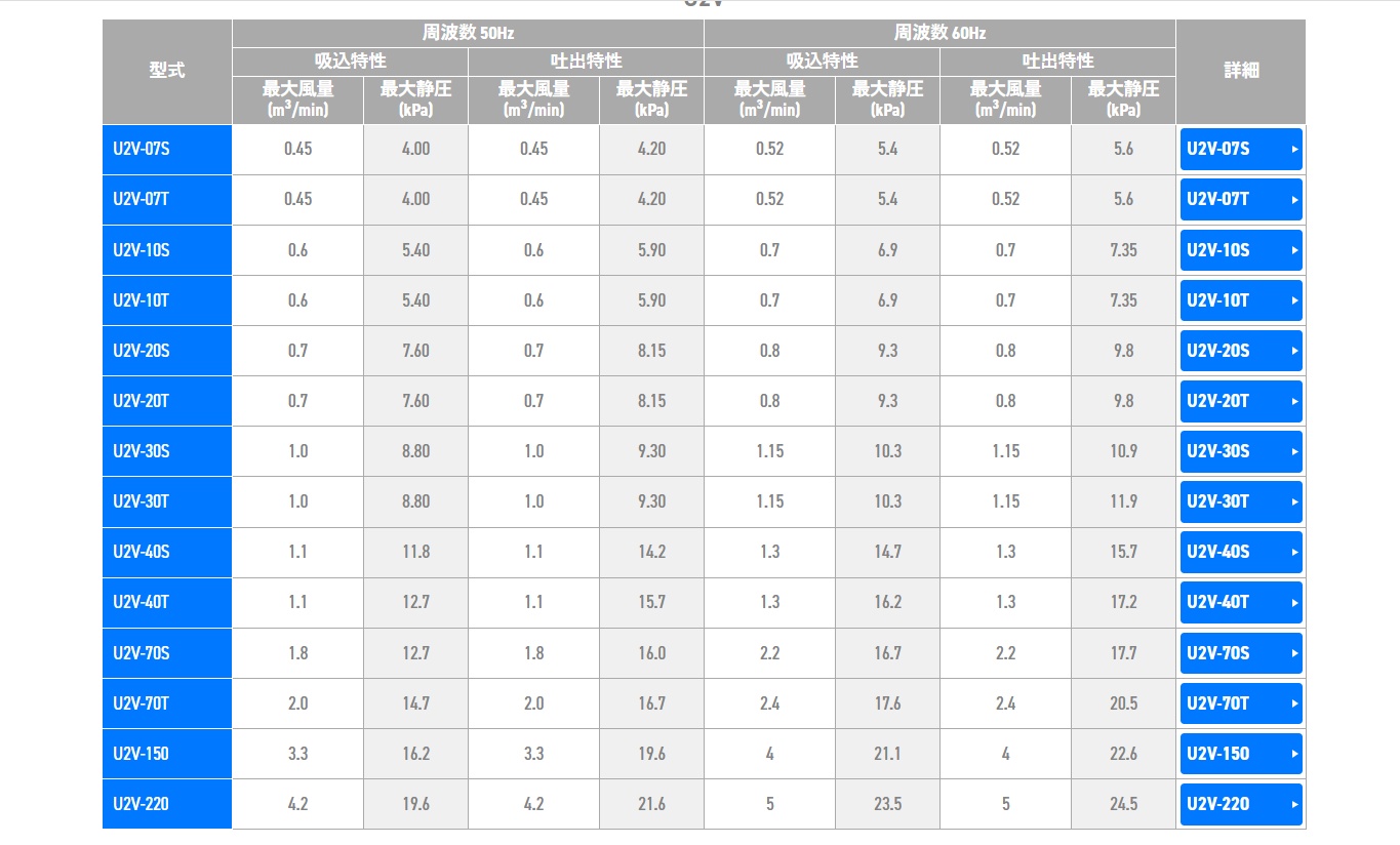 最大静压:50Hz 9.3kPa;60Hz 10.9kPa