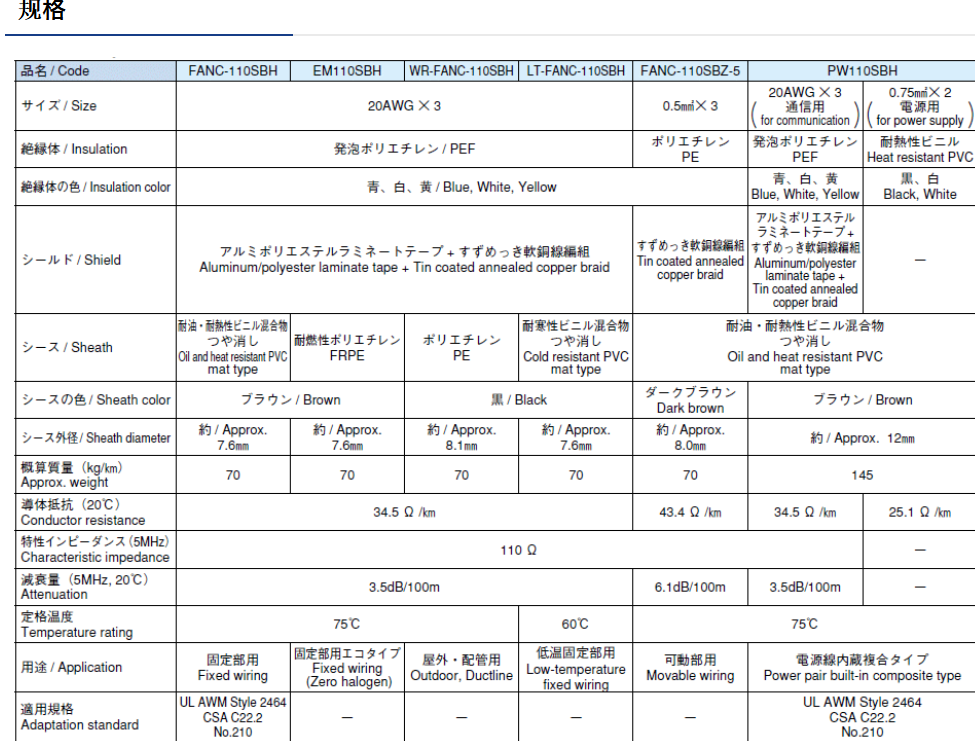 标准 FANC-110SBH 和内置电源线的组合式 PW110SBH 符合 UL/cUL AWM 标准。