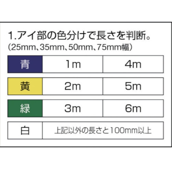 当て物を使用していても荷物の横滑りや周囲の壁や物への接触、加圧などによりスリングが損傷および切断する可能性がありますので作業環境には十分に注意してご使用ください。