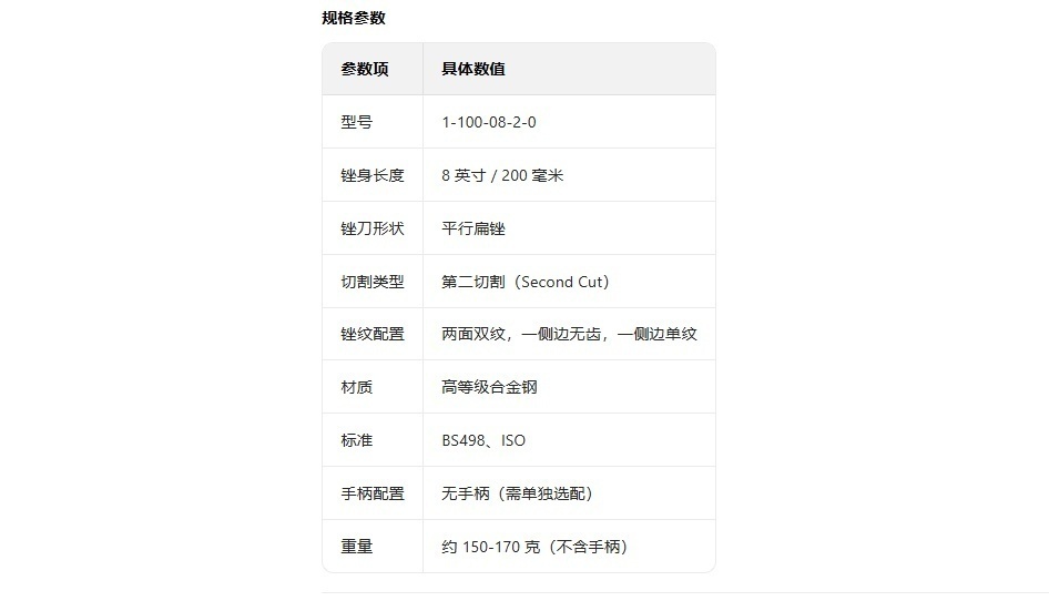 瑞典 BAHCO(百固,俗称鱼牌,隶属 Snap‑on 集团),产地葡萄牙;型号 1‑100‑08‑2‑0:100 = 平行扁锉,08=8 英寸(200mm 锉身),2 = 第二切割(Second Cut,中等齿),0=无手柄(带柄款为 1‑100‑08‑2‑2,配 ERGO 软握柄)