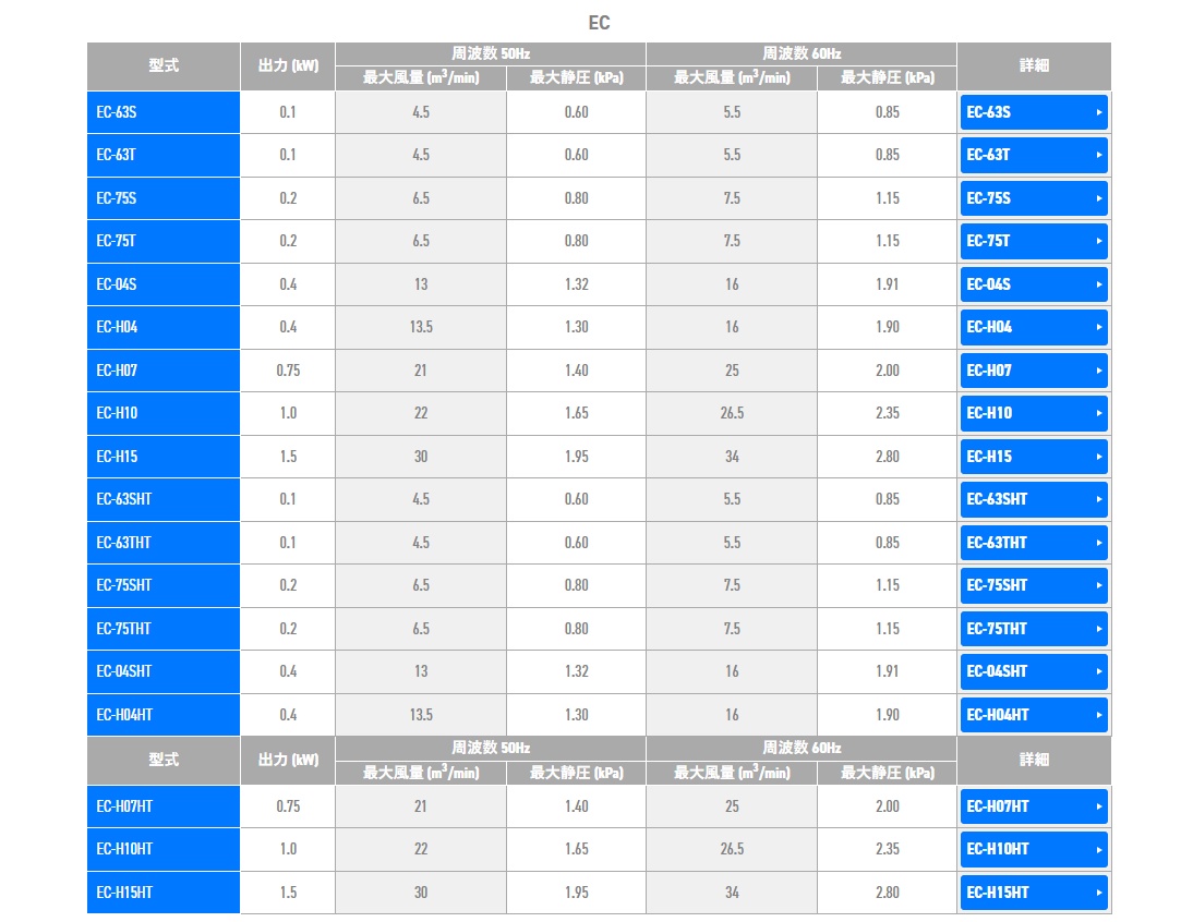 最大静圧1.15/1.65 kPa(50Hz/60Hz)