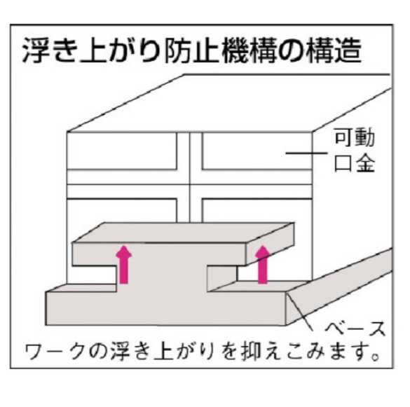 ワークを浮き上がりにくくするために、浮き上がり防止機構を採用しています。